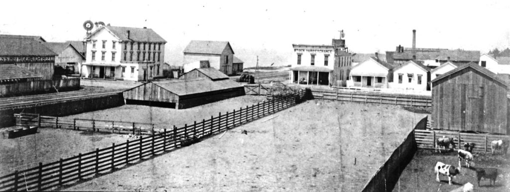 A panoramic view of Butchertown, looking north. The three-story Golden Gate Hotel is to the left, the two-story Stock Yard Exchange at the center and the smokestack of T.W. Corder Wool Pulling Works to the right. Photo: California Photo Views.