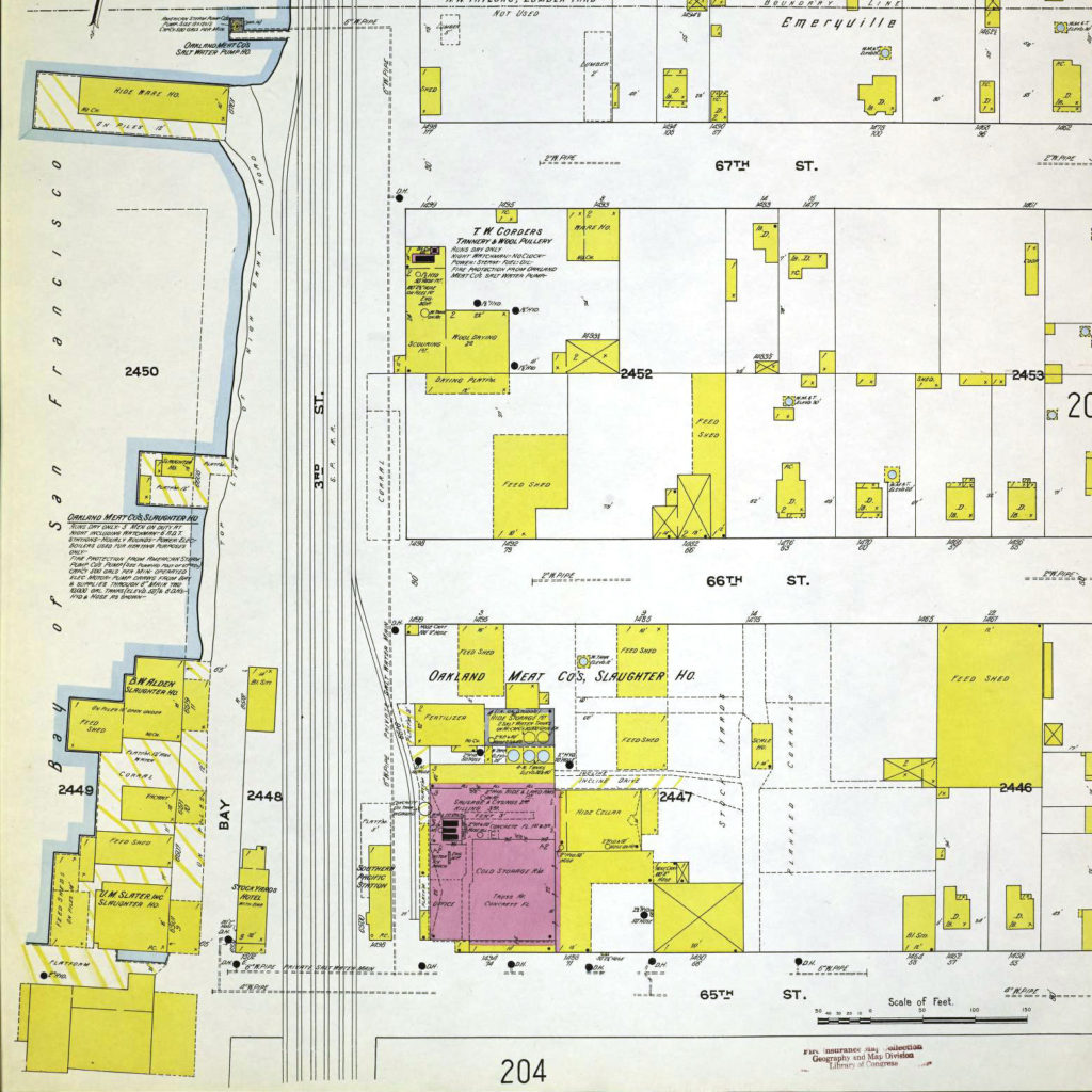 In the late 1870s the outlines of a central stockyard and packing house district became apparent in what is present-day Emeryville. Listed in early city directories as “the stockyards,” the site was ideal because it was adjacent to the railroad for transportation, as well as to the margins of the San Francisco Bay, which could be used for refuse disposal.