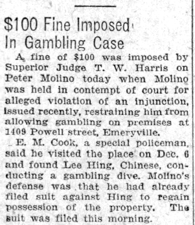 Following his arrest, Molino was fined $100 but released from custody. The proprietor of the gambling operation, Lee Hing, appears in news archives throughout this period of prohibition.