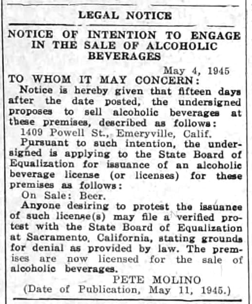 The owner at the time was listed as Pete Molino. Molino was an Italian immigrant who came to Oakland about 1912. He married the following year.