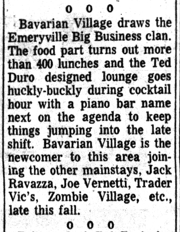 Bavarian Village opened at a time when Hofbrau style restaurants, with hearty portions and ample beer selection at reasonable prices, were growing in popularity across the Bay Area.