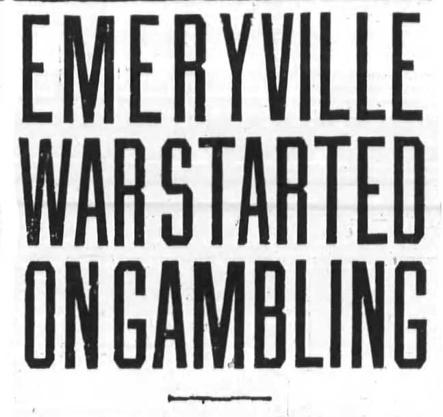 The site was targeted for “abatement” by then District Attorney Ezra Decoto (Earl Warren’s predecessor) with the headline “Emeryville War Started on Gambling.”