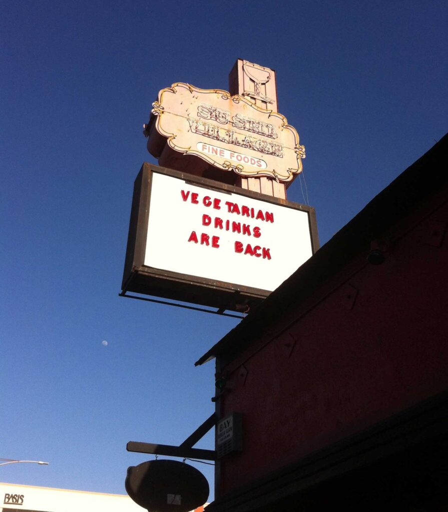 When they initially opened, they offered a nod to the unfortunate missing comma in Sushi Village’s marquee advertising “vegetarian drinks.” They used the marquee to post other cryptic messages including “The Dude Abides,” a reference to the 1998 cult film The Big Lebowski.