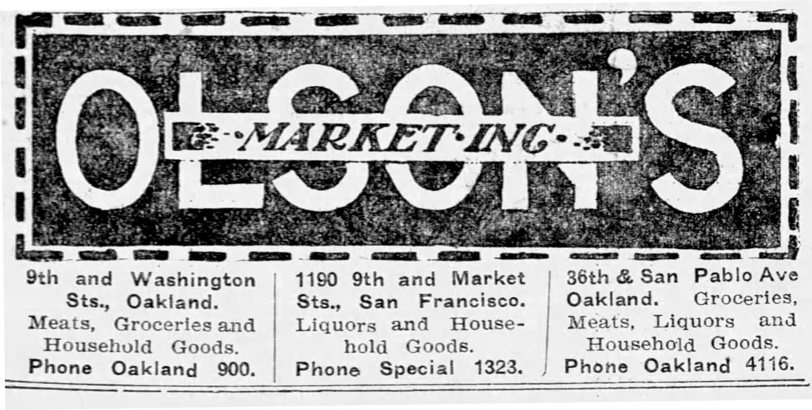 The first occupant was for a small grocer named Olson’s Market who operated two other locations including one in San Francisco and one in Oakland. After this, 3601 was briefly occupied by a “Toggery” (Clothing Store) in 1911.