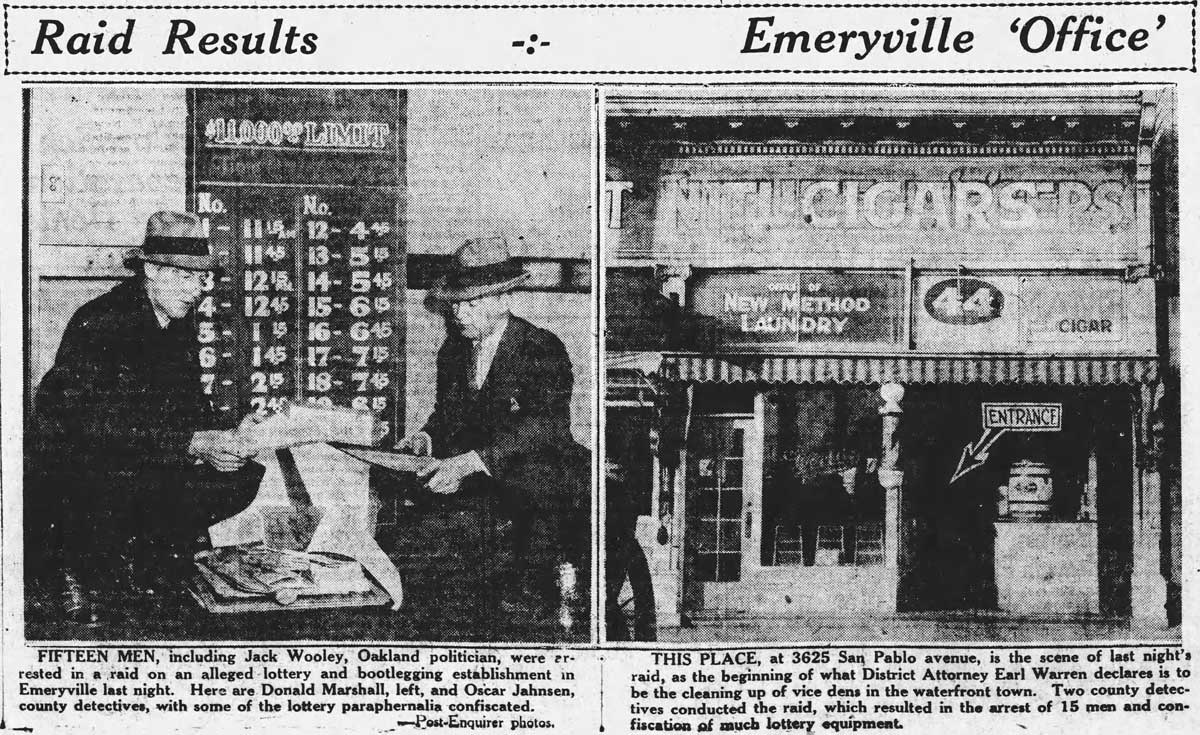 Next is 3625 San Pablo Avenue, now a small open lot serving adjacent businesses. Early records identify this site as a barber shop that also sold cigars. During Prohibition, newspaper accounts place it at the center of vice raids involving lottery games and bootlegging. At the time, it was owned by local Oakland politician named Jack Wooley.