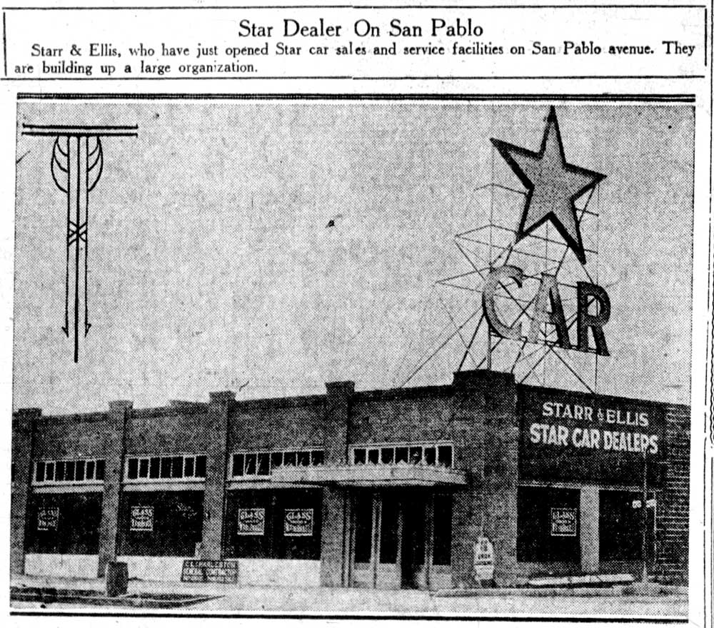 Next is the long building spanning 3631–3637 San Pablo Avenue, originally constructed in 1923 as the Starr & Ellis automobile dealership. The firm sold the Star Car, an affordable model positioned as a competitor to the Ford Model T. The Star was produced by Durant Motors, founded in Lansing, Michigan, which also operated an assembly plant in East Oakland. Despite early promise, Durant struggled to compete with the growing dominance of Ford, General Motors, and Chrysler, and production of the Star ended in 1928.