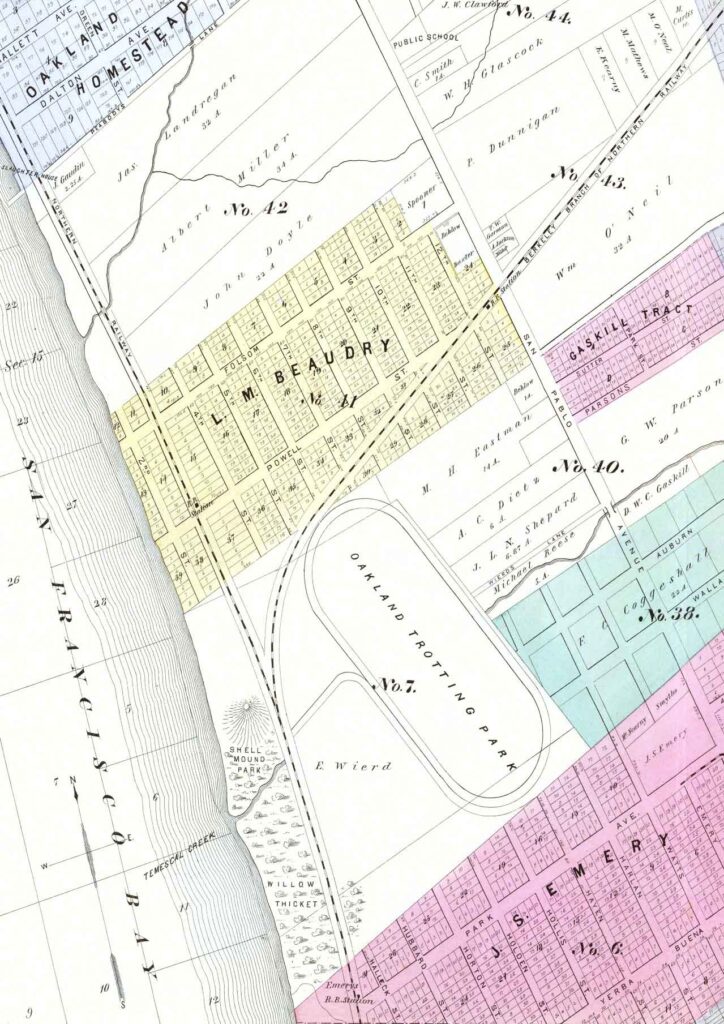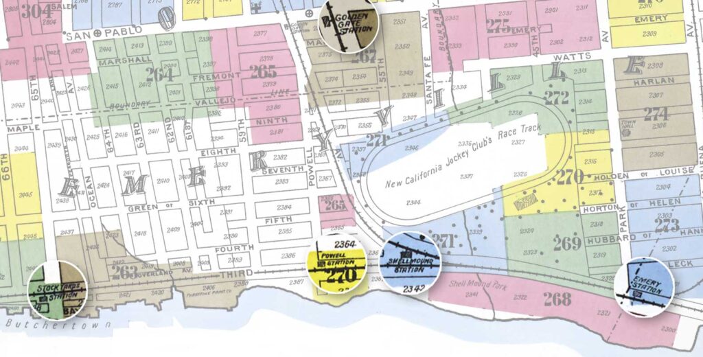 Five stops were serviced within Emeryville by these Electric Lines. These included: Powell Street (intersecting where Beaudry now is); Ninth Street Junction (here at Peladeau & Stanford where the two lines split); Shellmound Junction (about where the line crossed Temescal creek); Shellmound Park (near the southern end of the park where the entrance was); and The Emery Station (at the foot of Park Avenue).