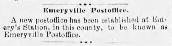The first mention of “Emeryville” in news archives was in 1884, 12 years prior to the city’s incorporation. Several news archives announced the establishment of an “Emeryville Postoffice” at Emery’s Station.