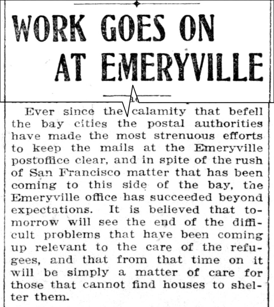 Mail being sent to SF was shifted to this location and news articles indicated the efforts were admirable despite the circumstances stating, “the Emeryville office has succeeded beyond expectations.”