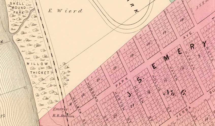 In 1877 when the Northern Railway was built along the shoreline that bisected the land that would become Emeryville, a stop named “Emery” was added on Joseph Emery’s property.