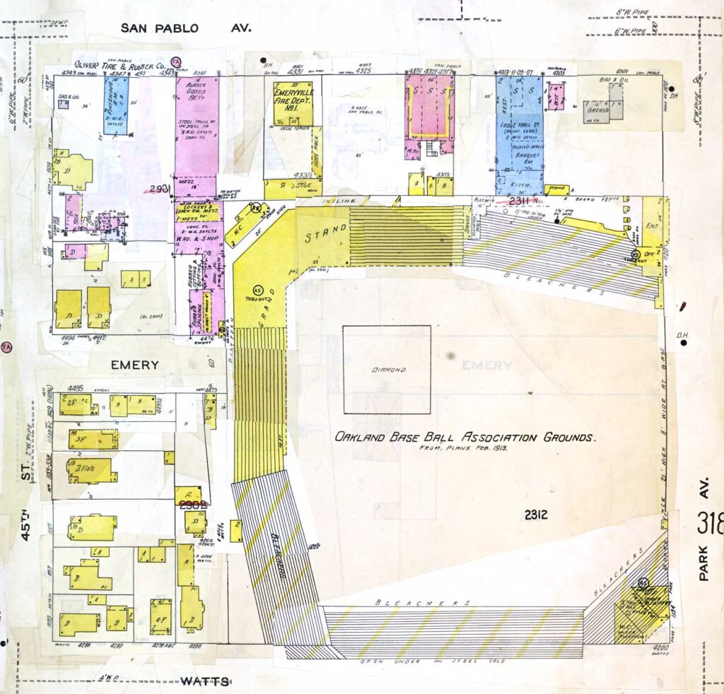 Also in 1912, the historic Emery Estate was relocated to 4325 San Pablo Avenue, adjacent to the fire station, to make room for the construction of Oaks Ballpark.