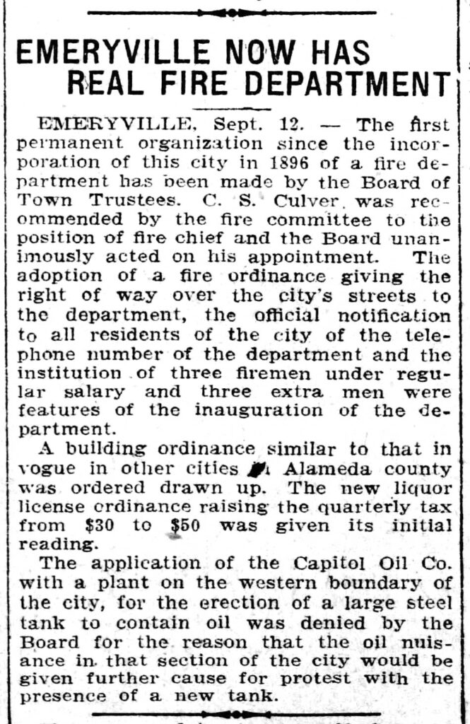 After Emeryville incorporated in 1896, the town had no fire station of its own, relying instead on nearby Oakland for protection. This arrangement worked at first: early Emeryville was largely rural, with a small population and relatively few structures.