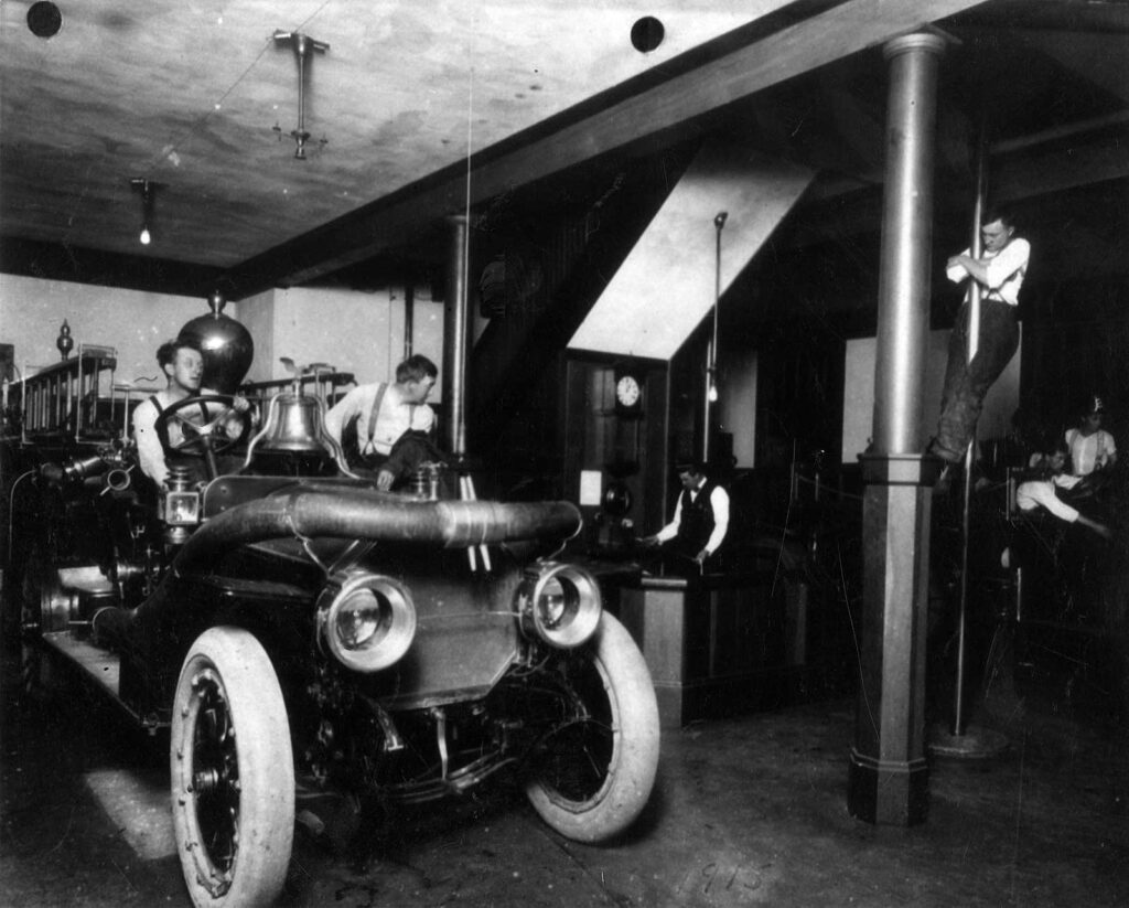 The two-story Mission-style building featured arched garage doors, a tile roof, and a hose tower used to dry cotton hoses and prevent mildew. Inside, two brass descent poles—better known as fire poles—allowed firefighters to quickly slide from the upstairs dormitory and offices to the apparatus floor below.
