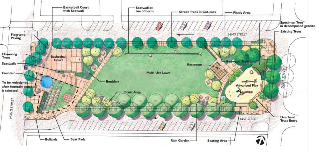 The popular and well-trafficked Doyle Hollis Park in the center of Northern Emeryville is an anchor of this original section of Emeryville’s Greenway.