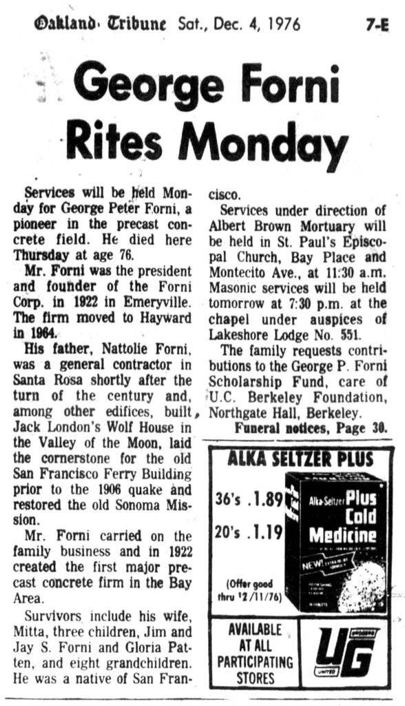 Founded by George Peter Forni, the Forni Corporation is considered a pioneering precast concrete firm in the Bay Area.