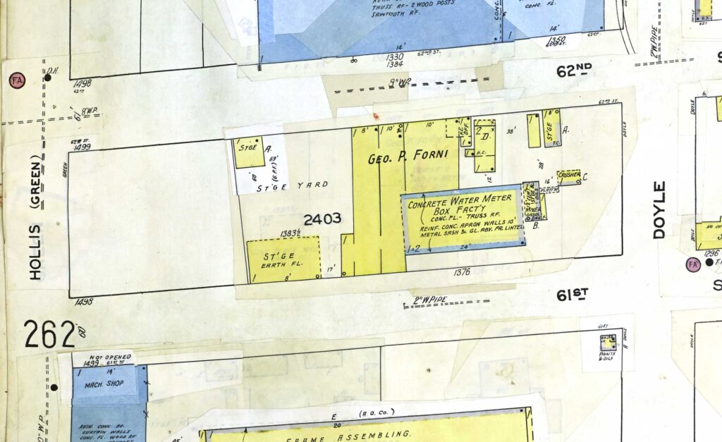 The site, straddled by 61st & 62nd streets along Doyle, is documented as first being used by the Forni Corporation (also referred to as Forni Manufacturing) who were first established in 1922.