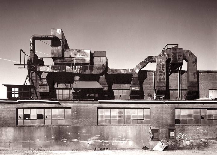 The two-story building had a smooth brick surface and a Gothic parapet. At the rear of the building was a mass of convoluted ducts.