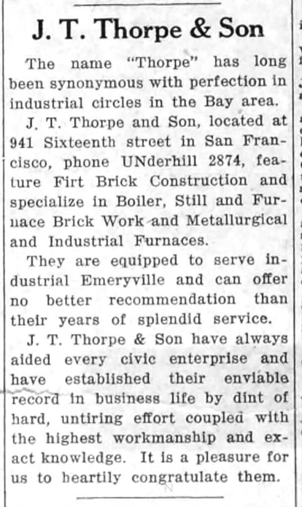 Members of the J. T. Thorpe family worked in brick and masonry and they quickly formed a company around helping rebuild San Francisco.