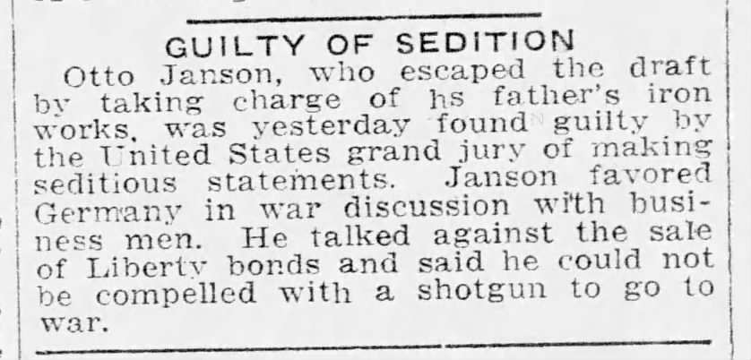 In 1918, Otto Janson was accused of expressing sympathy for the efforts of the German side of the war effort as well as malevolence toward then President Woodrow Wilson and the participation of American soldiers in the war. He was charged and found guilty of sedition and sentenced to 5 years at McNeil’s Island penitentiary in the State of Washington. This sentence was later reduced to 2 years.