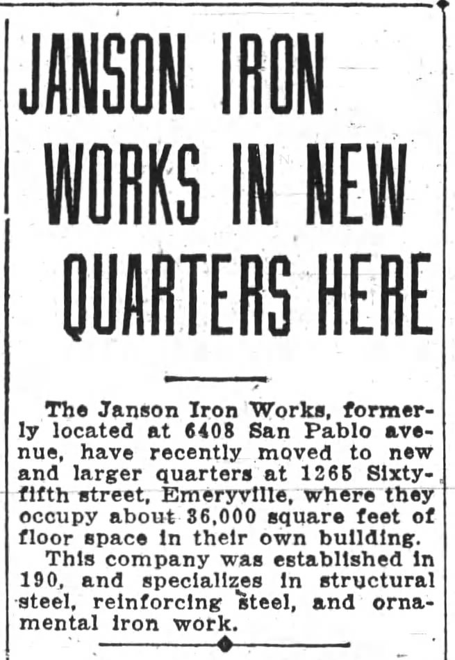 A month after his passing, the firm was moved to their new 36,000 square foot plant at 1265 65th St. in Emeryville. The factory continued to specialize in structural and reinforcing steel as well as ornamental iron work.