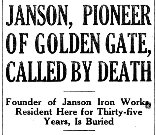 Otto Janson died on April 28, 1933 at the young age of 42. At the time of his death he was living at 1515 Holly Street in Berkeley.