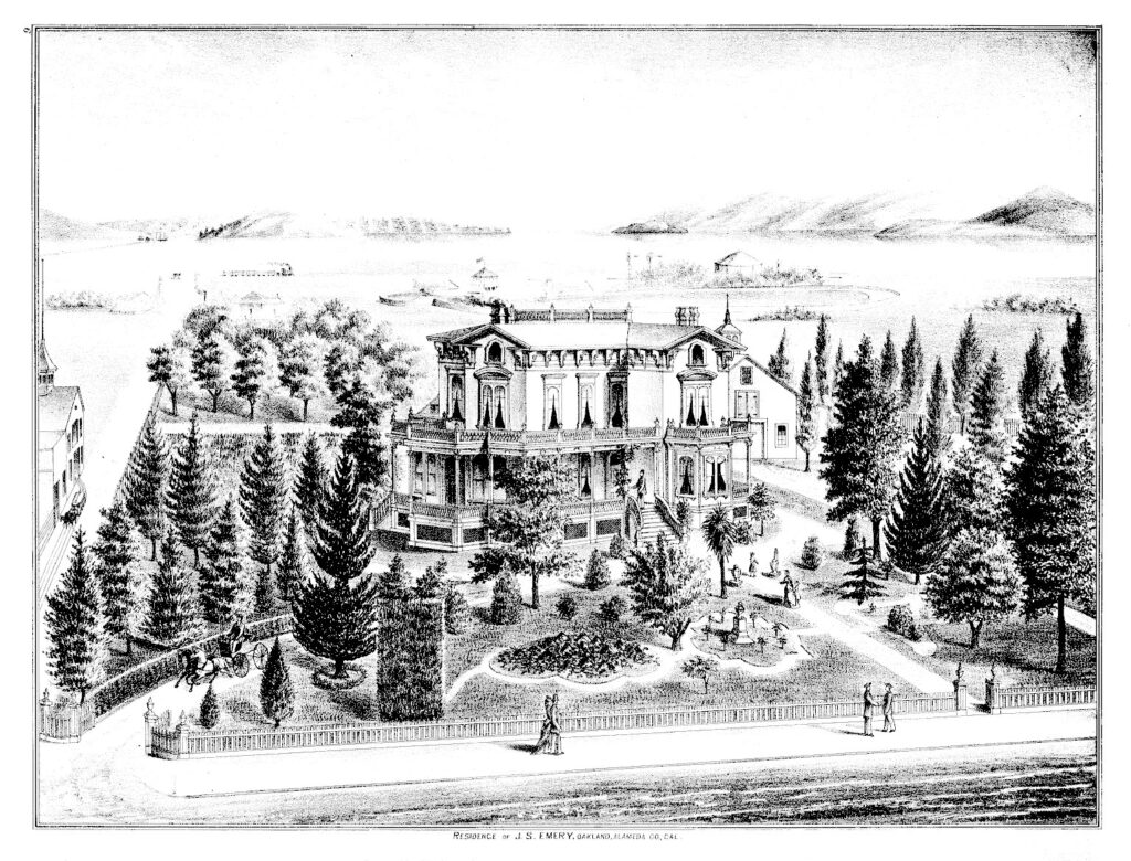 In 1868 Emery built a stately two-story Italianate Victorian mansion at the northwest corner of Park and San Pablo Avenues. The mansion’s spacious rooms had eight-foot doorways and twelve-foot ceilings from which hung large, ornate chandeliers of crystal and brass. The many fireplaces were decorated with ornate tile. The grounds were beautifully landscaped with palm and eucalyptus trees and well-manicured hedges.