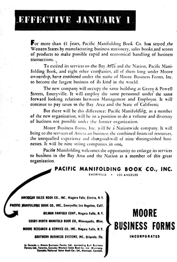 In 1945, Pacific Manifolding officially changed their name to Moore Business Forms Inc. unifying nine companies under a single corporation.
