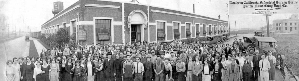 Pacific Manifolding’s original location was in Oakland at the corner of Second and Oak Street. In 1906 the firm bought a full square block of property here in Emeryville bordered by Powell, Doyle, Stanford and Green (now Hollis).