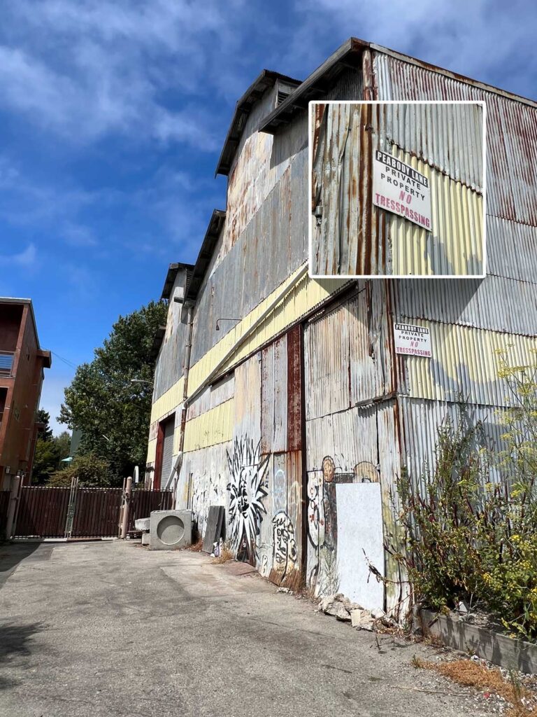 You’re standing near where one of Emeryville’s original streets now terminates. The private property between the Baker Metal building and the small stucco condominiums to the right leads to Peabody Lane.