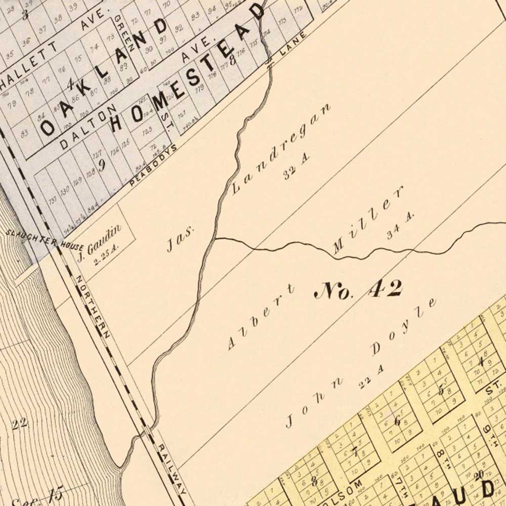 In the mid-1870s, the Northern Railway (later Southern Pacific) extended its tracks along the shoreline of today’s Emeryville, crossing the western end of Peabody’s Lane.