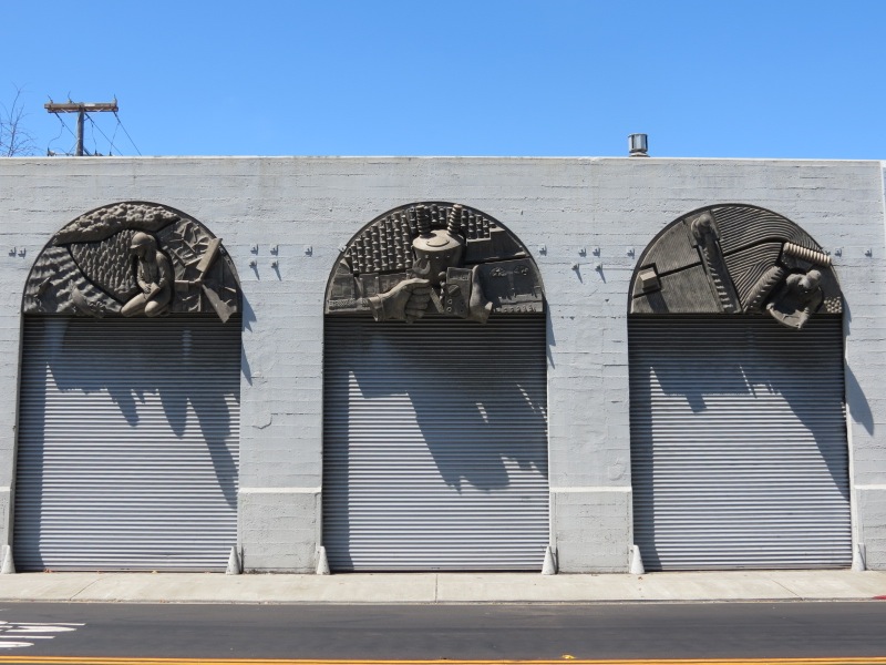 The six relief sculptures at the 4525 Hollis building were created by local artists Scott Donahue and Mark Rogero and are intended to depict the history of the utility company that was founded in 1905.