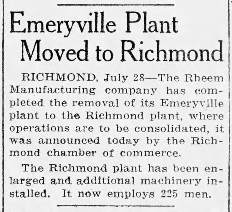 In 1932, Rheem closed their Emeryville plant consolidating operations with their Richmond facility.