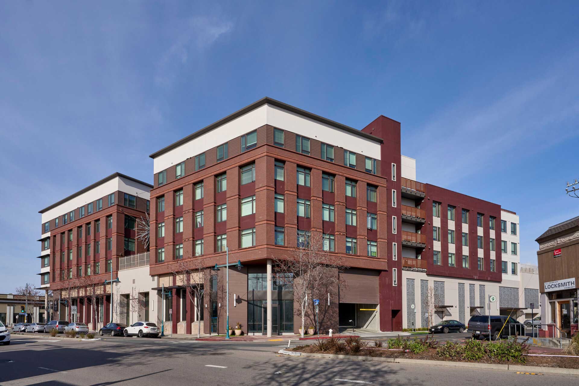 After funding delays, construction on the affordable housing project at this site began in 2016. The completed development, named Estrella Vista—Spanish for “Star View”—references its location near the Star Intersection, where San Pablo Avenue, MacArthur Boulevard, and Adeline Street converge.