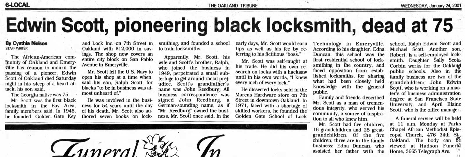 Golden Gate Key & Lock continued to grow steadily over the decades. They celebrated its 50th anniversary in 1996, and Edwin Scott authored seven books on locksmithing and founded a technical school to teach the trade. He passed away in 2001, after which leadership of the business passed to his son Ralph.