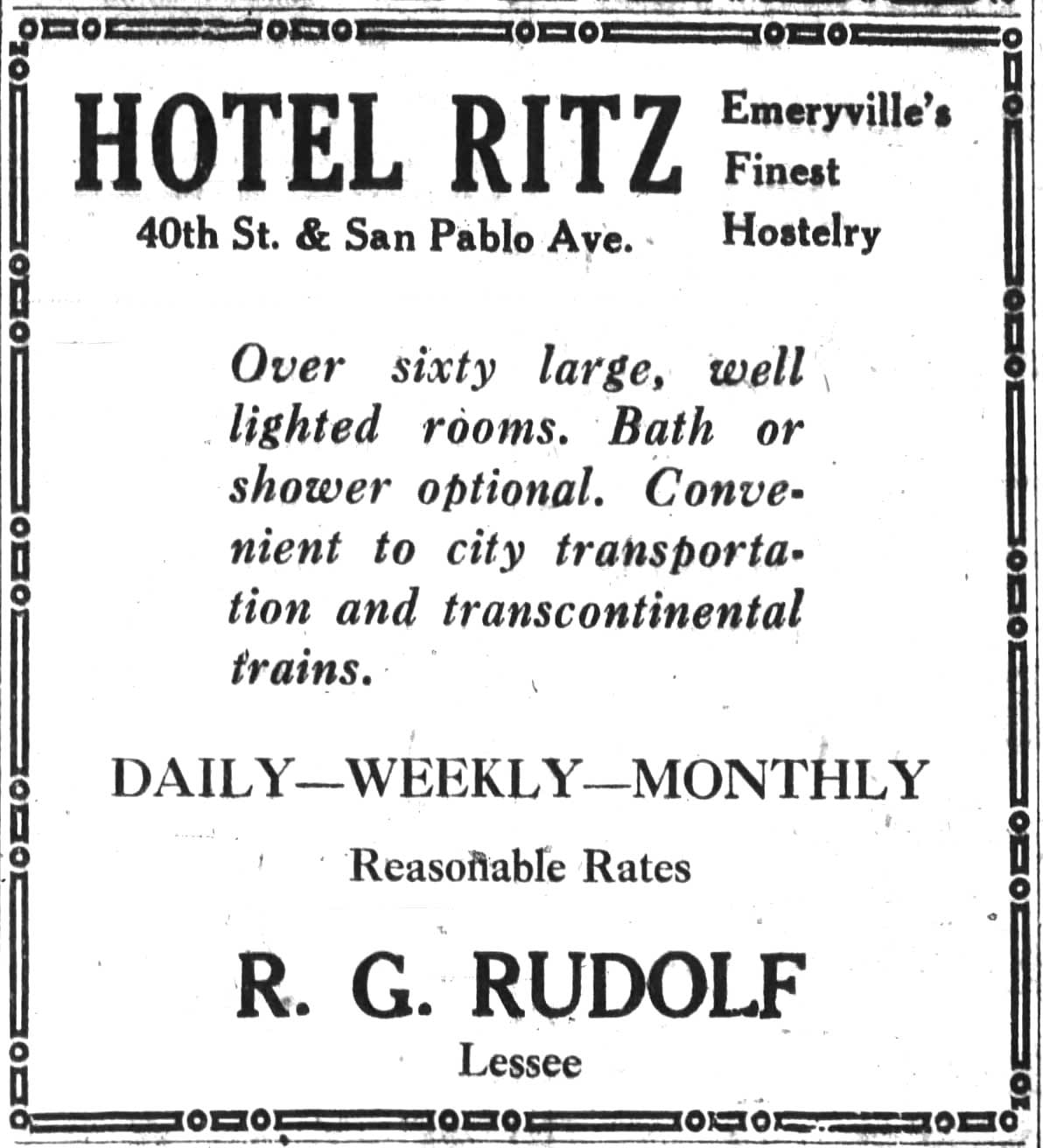 Its Grand Opening took place on June 25, 1929 with ads proclaiming the hotel to be “Emeryville’s Finest Hostelry.” “Hostelry” was a common term of the era for traveler-oriented lodging.