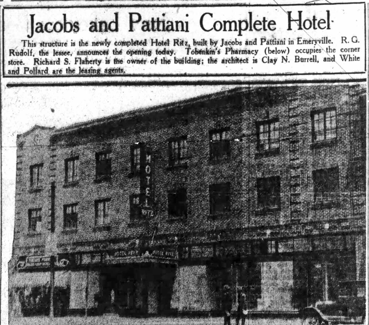 The three-story brick hotel that opened in 1929 at 3872 San Pablo Avenue was designed by notable architect Clay Burrell. Burrell also designed the nearby California Hotel among many other structures in Oakland.