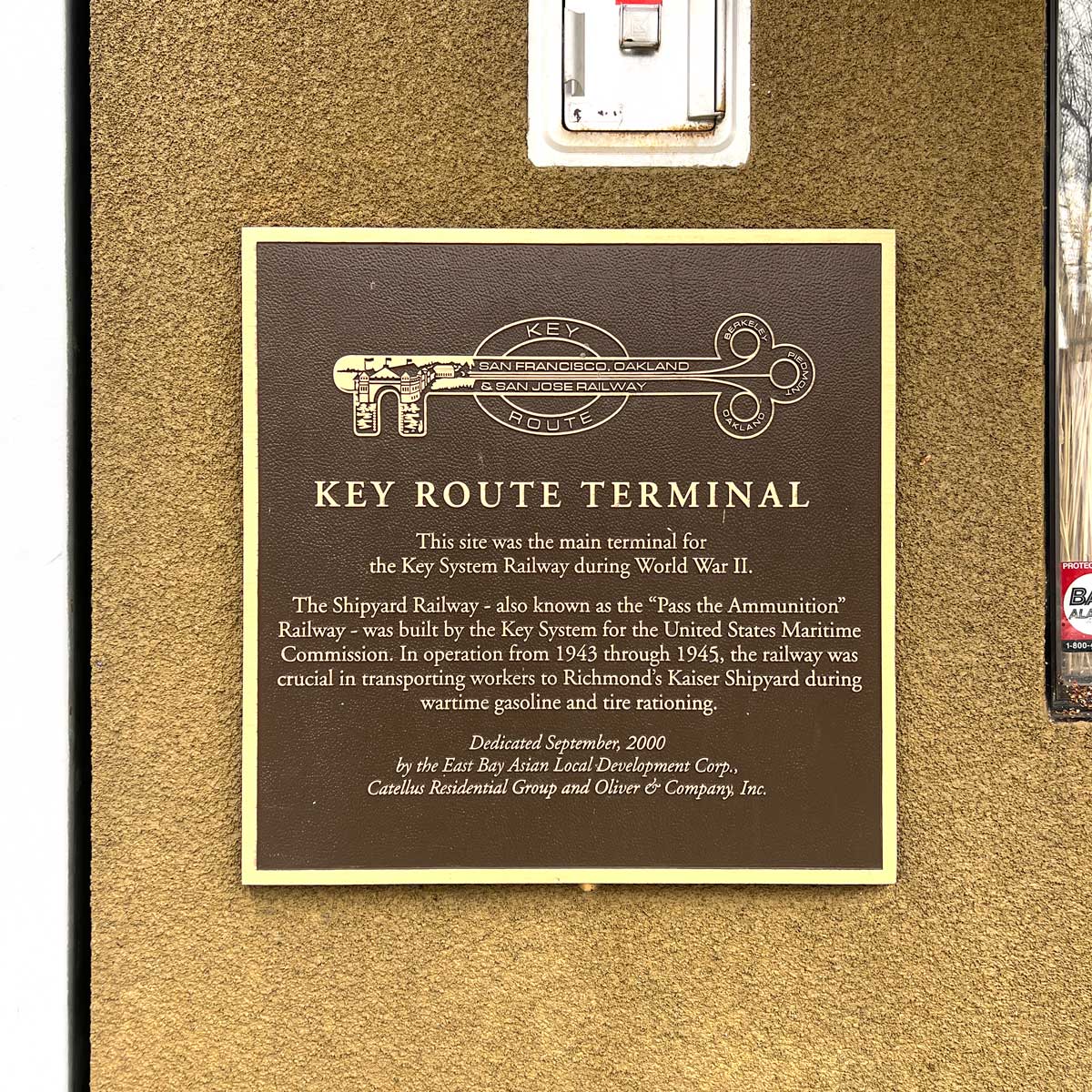 A plaque was installed on the outside of the new building acknowledging the Key Systems thoroughfare through Yerba Buena to the terminal that previously existed here.