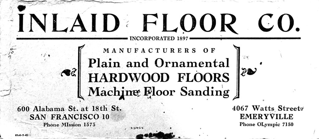 Inlaid Floor Co. was an SF-Founded Company that specialized in hardwood floors with patterns and ornamental designs made out of different colored woods. They expanded their operation to Emeryville in 1917 operating out of this warehouse on the north-west corner of Watts and 40th Street and employed about 20 workers with Alfred Gustafson residing as their President.