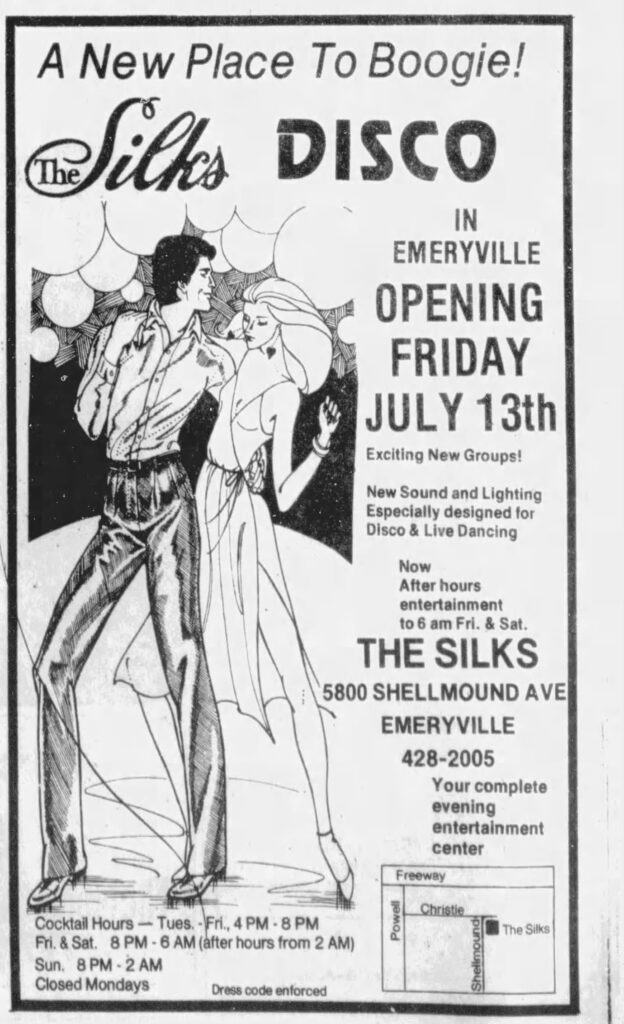 Disco had and still has its detractors. Those who wretch at the mere mention of the word will shout out for all to hear their opinion on the subject: “Disco sucks!” But no matter how much you may shy away from admitting you are a fan of the era, there is no one I know who will deny that The Silks in Emeryville, whether it was a Discotheque or not, was THE place to go.